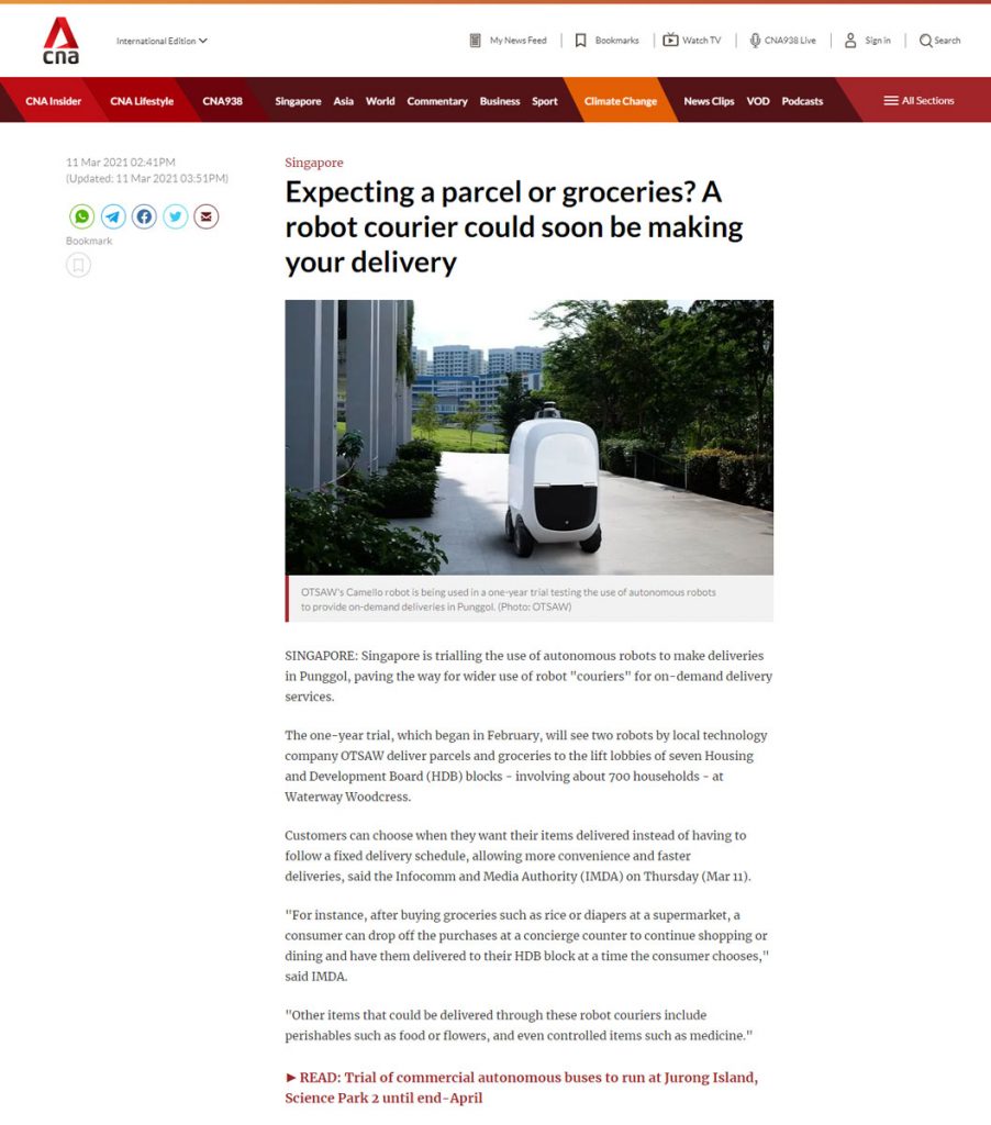 亞洲新聞臺(tái) (Channel News Asia) 特寫報(bào)道了 Activ OTSAW 的 Camello 最后一英里配送機(jī)器人在榜鵝 (Punggol) 的水路田園 (Waterway Woodcress) 的一年試用情況,該區(qū)域涉及 700 個(gè)住戶。